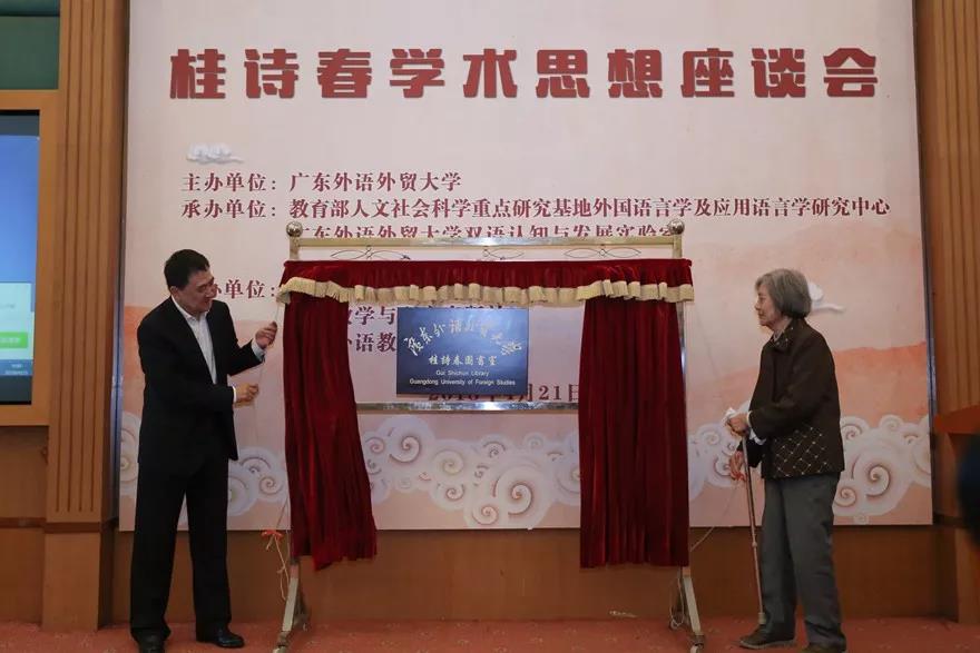 4月21日,桂诗春学术思想座谈会暨“桂诗春图书室”揭牌仪式在北校区国际会议厅召开。座谈会旨在进一步弘扬先生广博精深的学术思想,传承先生孜孜探索、敢为人先的精神品格。我校党委书记、校长隋广军,原校长黄建华教授,桂诗春夫人安群及来自全国17所大学近60名专家学者参加座谈。