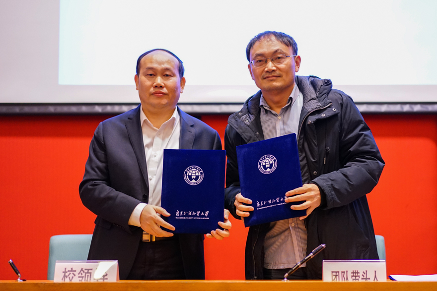 12月19日,2017年度第二批校科研创新团队外国文学学科团队立项签约仪式暨在研科研创新团队总结会在北校区国际会议厅举行。副校长阳爱民与4位新立项团队带头人、2017年教育部优秀结项科研创新团队带头人陈伟光教授、18个在研校科研创新团队带头人及成员、团队依托单位分管科研负责人及科研处相关人员等出席了会议。科研处处长陈彦辉主持签约仪式。