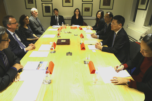 11月23日下午,代表团拜会中国驻英国大使馆公使衔参赞沈阳。仲伟合介绍了广外国际化发展的近况及高端人才海外招聘计划。沈阳公参表示,中国驻英国大使馆教育处将积极支持广外的高端人才海外招聘计划,为广外引进海外高端人才做好宣传、牵线搭桥。