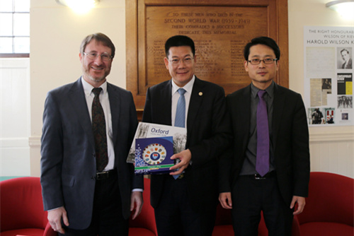 11月23日上午,仲伟合访问牛津大学(Oxford University)。他首先访问牛津大学最年轻的St. Catherine College,与院长Roger Ainsworth教授就学生交换项目进行了愉快交谈。随后,仲伟合在Jesus College与牛津大学“牛津展望计划(OPP)” 主任王世东主任、学术主任Ben Clyde博士等就下一步深度合作进行深入商谈。双方同意2016年初在广外设立OPP华南地区办公室,以该办公室为中介,广外将与牛津大学在学术与管理培训、高端学者访问、学生交流等方面展开合作。中午,仲伟合等与Worcest College教务长Scott Scullion教授、Micheal Mayob博士进行午餐会。经过洽谈,Worcest College有望每年接受我校1-2名英语或商务英语专业学生到该学院访问交流。