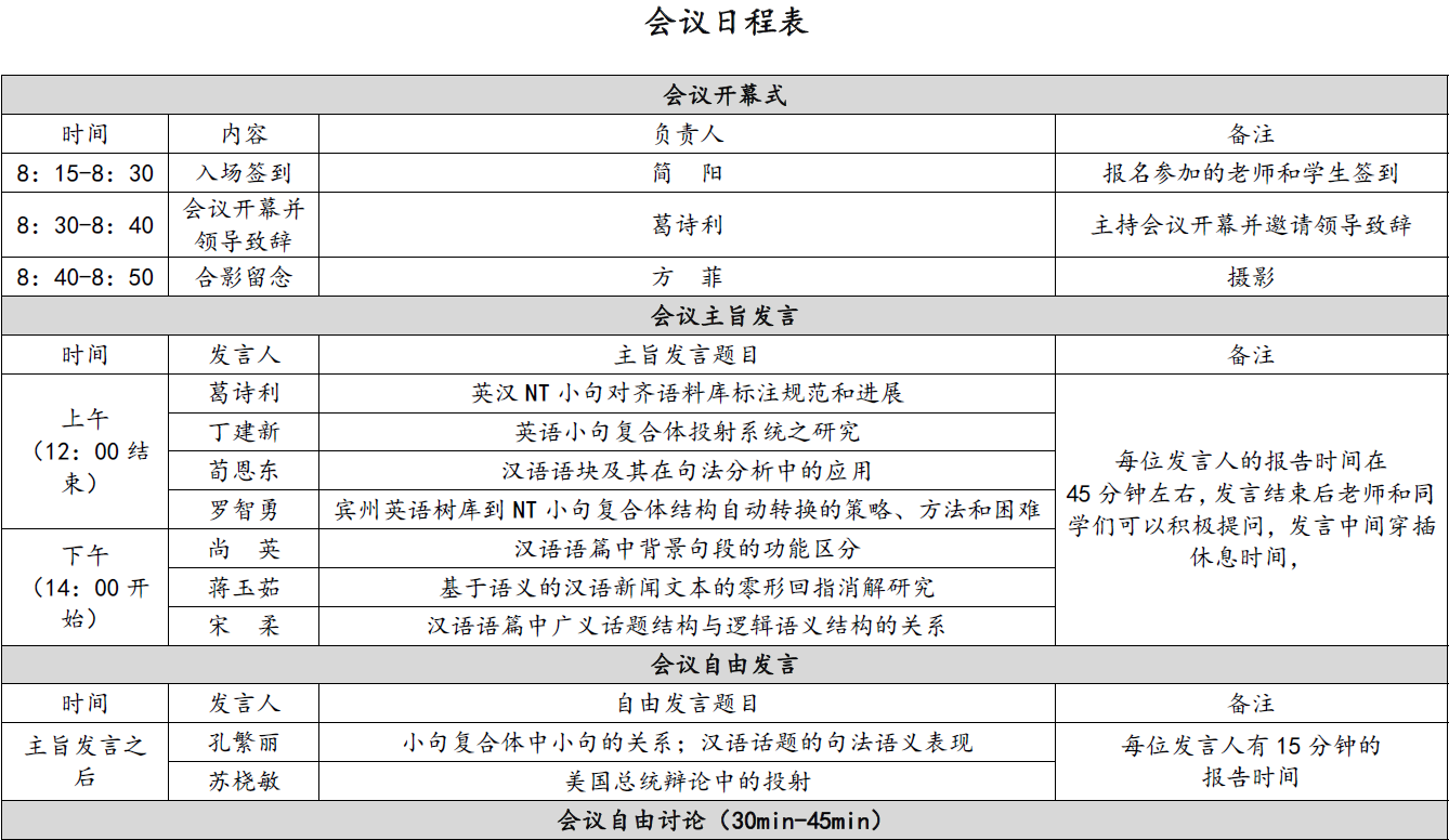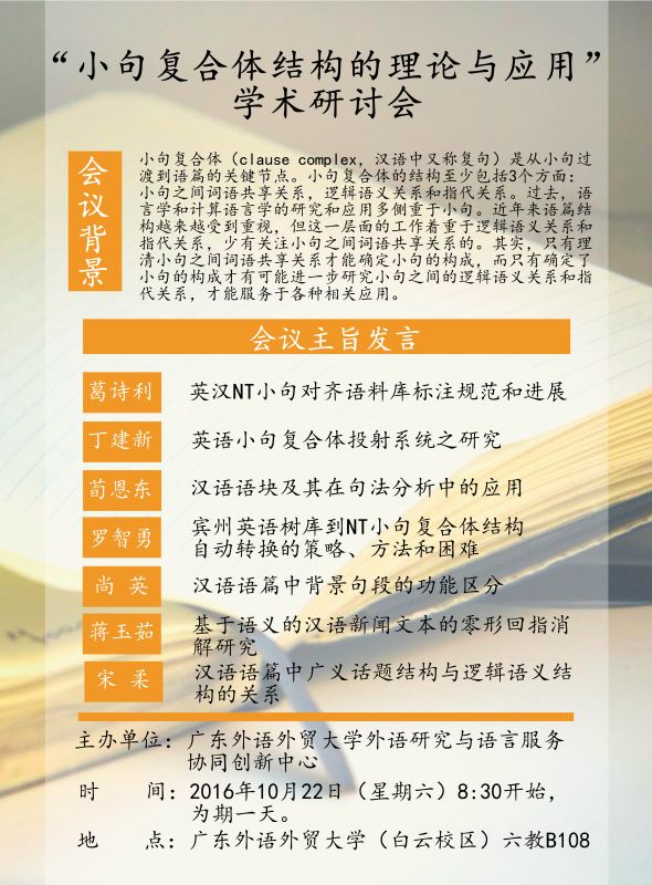 欢迎有兴趣的师生参加并自由发言、提问和评论。自由发言只要相关于小句复合体结构的理论和应用即可,包括小句之间词语共享关系、逻辑语义关系和指代关系等,并不限于主旨发言的内容。本研讨会为学术交流,不收取任何费用,往返交通与食宿自理。请有意报名的各位学者、老师及同学按照附件1中的回执填写信息,回执文件请以“姓名+所在单位”命名并发送至13268061164@163.com,报名截止日期为2016年10月18日18:00。